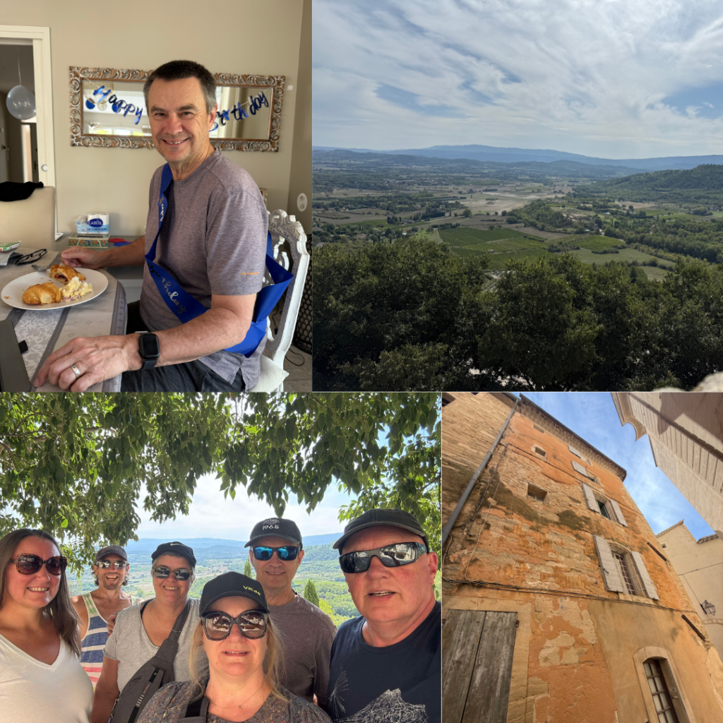 The big 6-0 day arrived on September 8th, our lovely friends decorated the villa with balloons, streamers and bunting and bought Steve a sash to wear for the day too. We added Raspberry jam and scrambled eggs to the croissant breakfast menu for the special occasion and then all headed out to visit beautiful villages. Steve did an amazing job driving the narrow windy street avoiding a range of hazards and navigating us though some tricky situations.
