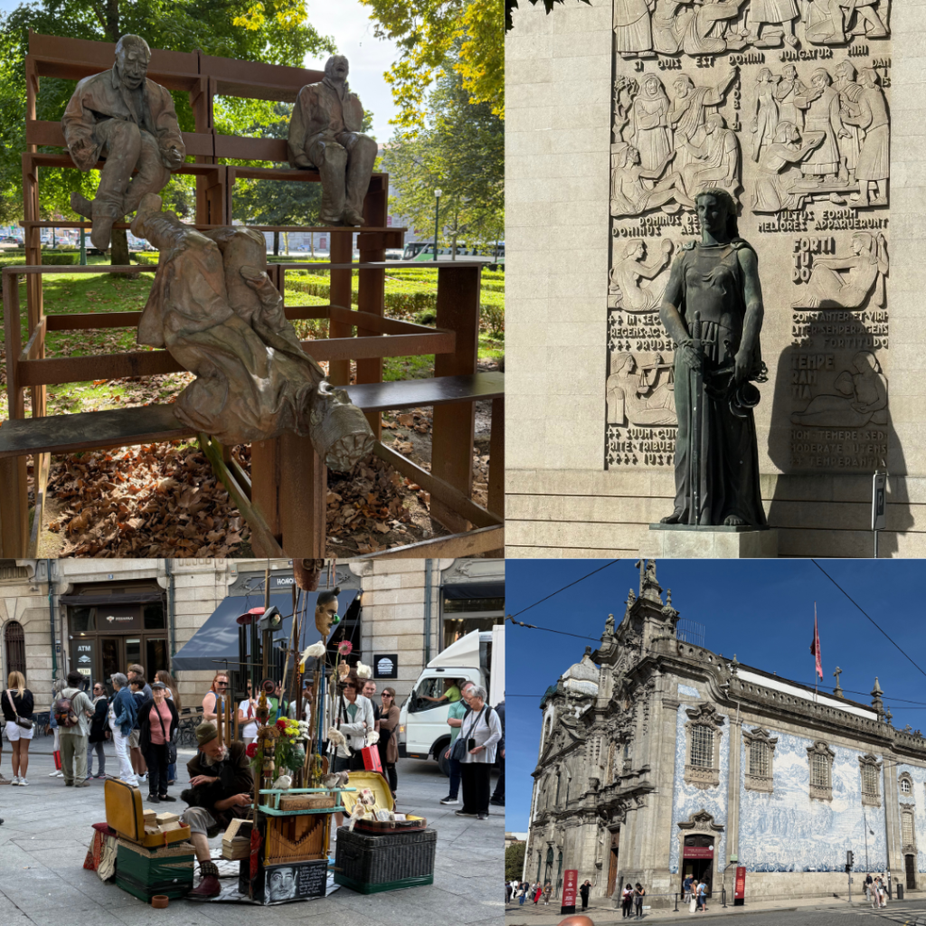 Walking tour – Steve was our tour guide and took us on a “top 10 sites in Porto tour”. Our apartment while fantastically located for local facilities is a 25 minute walk into the old town so was interesting to see the more residential parts of the city on our way there. Even though we had 10 sites to hit we saw dozens of others on each stage so it was a slow meander with many photos taken by everyone. We saw parks, monuments, fountains, the university, narrow streets with tiled buildings towering above us, churches, towers, markets (great local ones on a Saturday as well as the touristy ones too). We also saw a long queue for the Cathedral office where you buy tickets to enter the cathedral and get your camino passport.