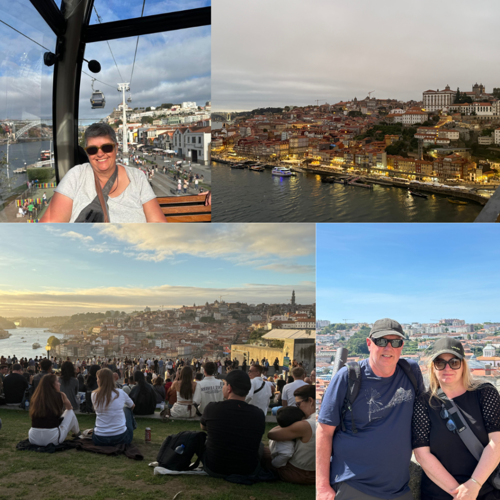 Sunset experience – our gondola ride took us up to Jardim do Morro a park perfectly situated to watch the sunset over the old city of Porto. It was a crazy experience, we arrived at 6pm for a 7:45pm sunset time. The place was already pretty full but over the next 90 mins it really filled up. There were vendors walking around selling everything – local foods, Brazilian foods, beer, wine, water, confectionery etc etc. Some took only cash others had card readers and others used a local app. There were some concrete walls with grass in between, we scored a spot in the sun on a concrete wall and Steve went to a churro vendor cart for a nutella sharing platter for us (yum) and then we people watched! it was a crazy place with increasing numbers of people, guys with coolers walking along trying to sell us stuff, people smoking everywhere and a cacophony of sound – boom boxes, buskers and bars nearby. It felt like we were waiting for a gig to start.