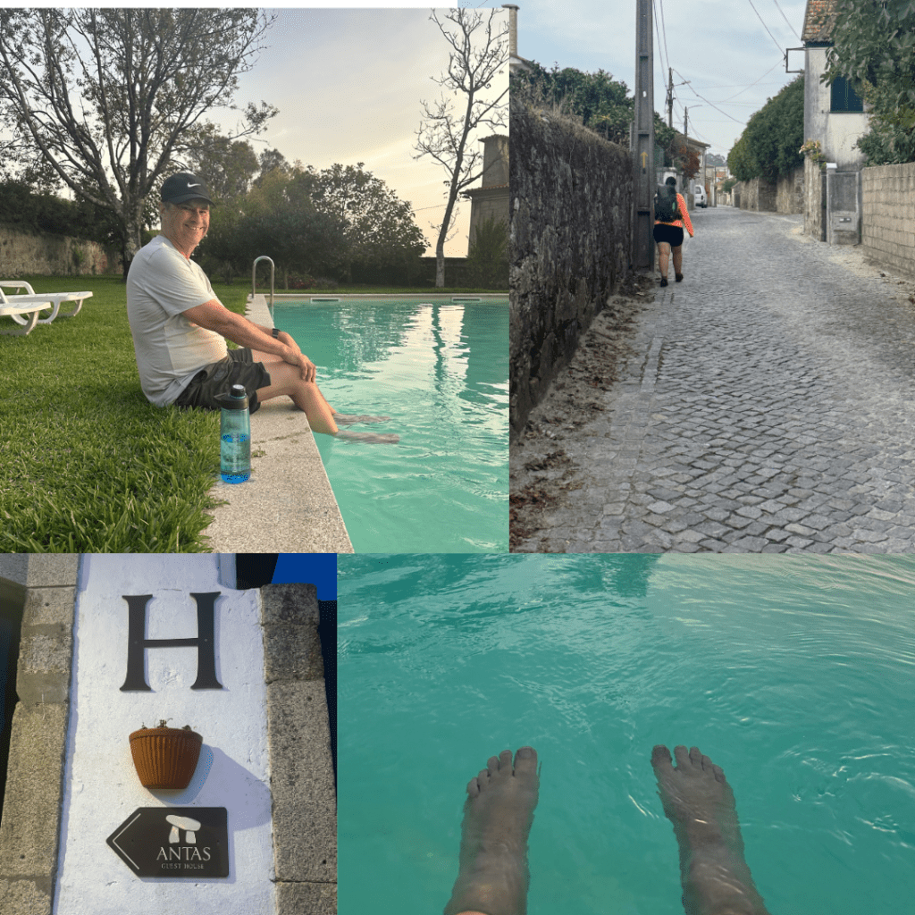 Antas Guest House – it was 7pm as we passed the little local store closing and 7:15 when we got to our Guest House. I knew there was a pool so dumped my bag and made a beeline for the pool, shoes and socks off and feet into the cold cold water for a soak, yay. We had a double room with extra bed tonight – so three single beds – in a reasonably sized room with a tiny bathroom. The facility had a huge guest space with couches and tables and a really well provisioned kitchen.