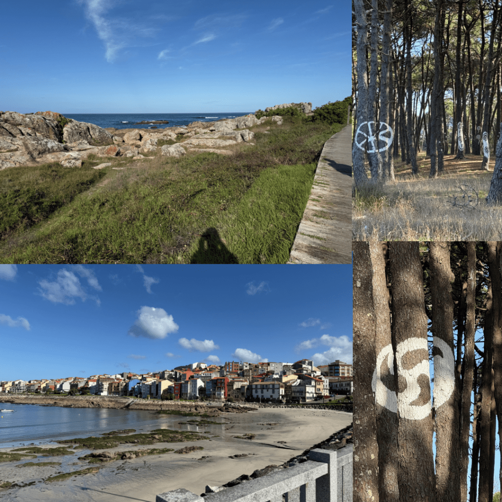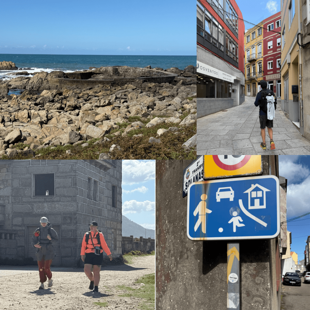 People always talk about “the Camino Provides” which sounds like justifying an experience to me, but as we walked into Oia there was a little church which had a stamp (I’ll tell you about stamps tomorrow) and a water tap about 50m down the road (we were basically out of water by now), then as we walked out of Oia when I was struggling to muster the willpower to continue, we found a lovely sandstone bench for a sit down. The last 2km were tough into a headwind but we got to see lots of giant hairy cows with horns and their giant calves, a few horses and lots of lovely coastline. Imogen got there long before us so stopped in the hotel cafe for an iced tea while she waited.