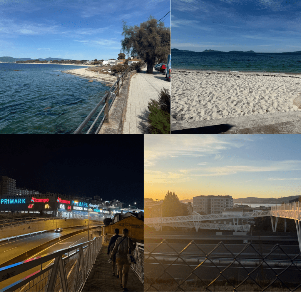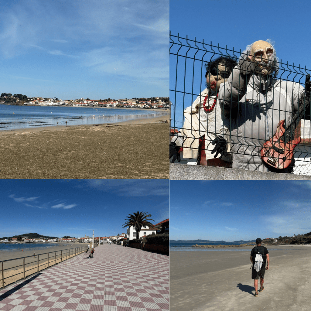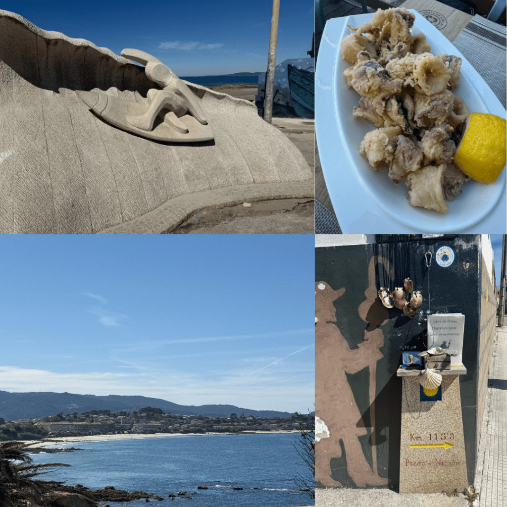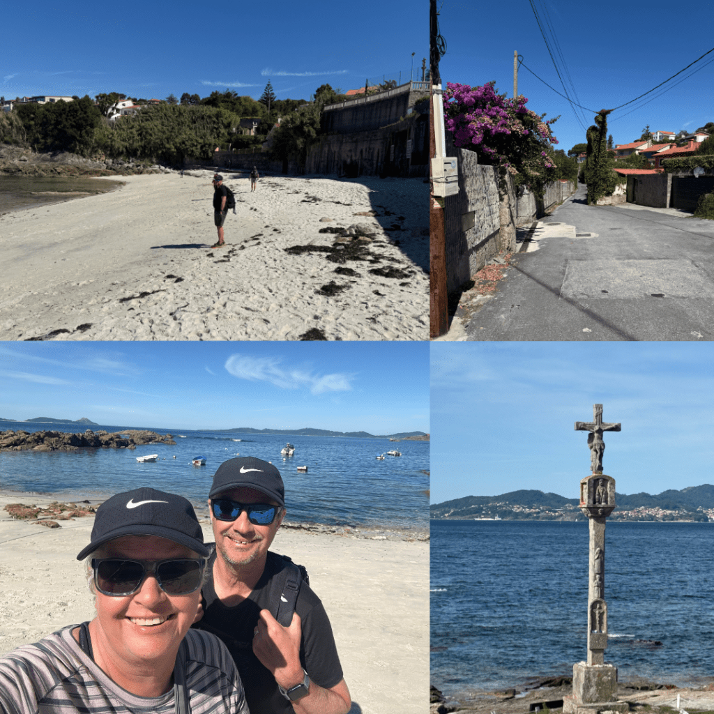 Today was unusual in so much as it was fairly flat – little did we know this was the last properly flat walking we would be doing. The track took us onto beaches for short bursts but was also often in suburban streets. We found a fantastic restaurant overlooking a wee bay for fresh calamari and tuna salad – one of our best meals in Spain. Then continued walking. There were way less people on the path which could have been how late in the day we left or could have meant most opted to take the Coastal Route for this segment, many bloggers say to avoid Vigo but we wanted to stick with the seaside.