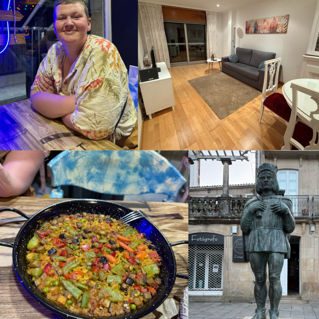 We liked the older centre of Padrón, narrow pedestrian streets with lots of statues and artwork. Imogen had scoped out a Mexican restaurant for our dinner tonight so after finding our apartment and showering we headed off there – it was very windy and much cooler (like 18C) this evening so we donned our merino. The Mexican was interesting, lots of vegan options which we ordered via a tablet on the table. We enjoyed our first paella in Spain and some amazing guacamole – but the rest was average although it was lovely to go out for dinner.