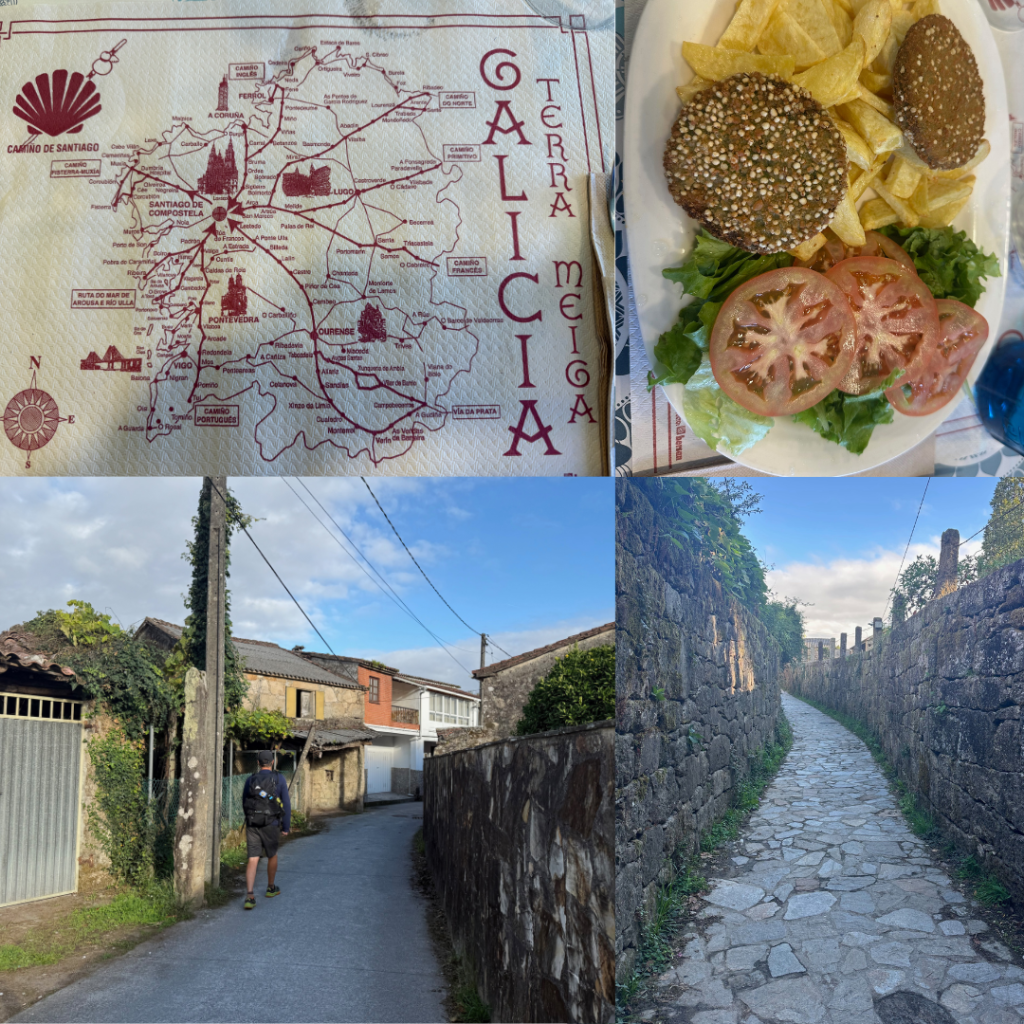 Today was mostly on back roads, occasionally alongside the main road and for a couple of sections through forest. The wind was more a breeze now and it was cooler when we started out but quickly heated up to around 23/24C. Imogen caught us right on the 5km mark just after we had given a bagpiper busker some coin in exchange for a stamp. We know there will be other kiwi’s on the same Camino as us but didn’t meet any at all as we walked, that said I swore one man said Kia Ora as he biked past us this morning.