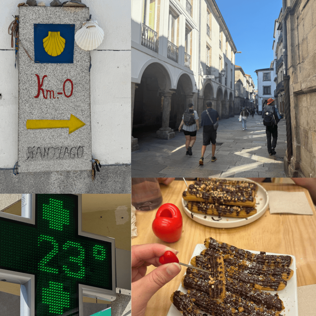 We played a final game of 20 questions, discussed our reflections on the walking and what we think went well / would do differently. We also got to say hi to some Camino friends but for the most part everyone we saw today was new. At one point there was a choice to make, two Camino paths into the city, we chose the longer one with our fresher legs and enjoyed wandering up the back streets – whereas the more direct route (that everyone else chose) took the busy main road. Less and less Camino signs were present and we diverted slightly to go to a Vegan Churro place before they closed at 1pm! Yum but sweet and sickly.
