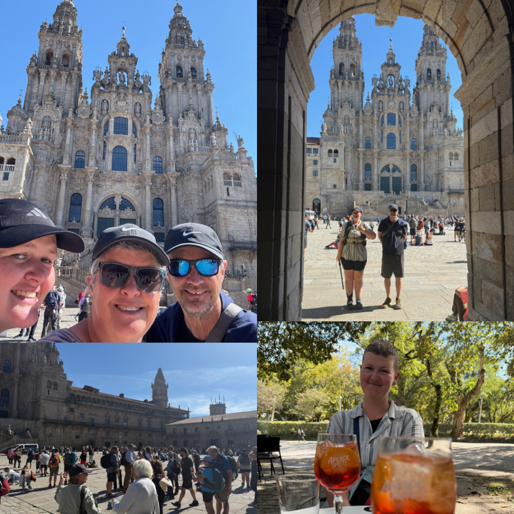 We wanted to get our Compostela, we had done the work on getting the stamps so we headed to the pilgrims office, scanned the QR code and filled in our personal details. Then we were given a number and told to queue to the left – I reckon there were 100 people in front of us in the queue when we joined down a narrow corridor near the toilets. It wasn’t fun but did move quite quickly with 15 processing people scheduled on. Our numbers came up one at a time on the big screen and Imogen and I were processed in 2-3 minutes, Steve on the other hand had struck up a conversation about his journey so I went looking for him 10 minutes later chatting away!