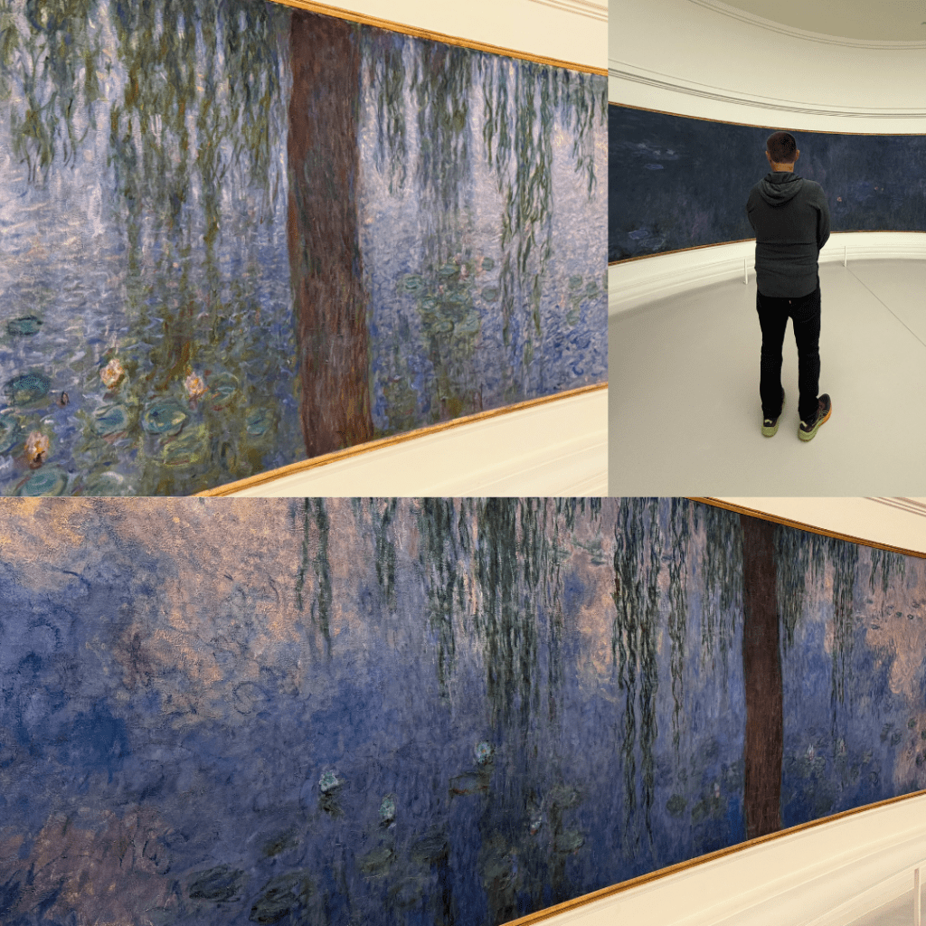 With about 5 hours to kill before Milla arrived we headed off to Musée de l’Orangerie which has been on Steve’s list to visit every time we’ve been in Paris. It’s such a unique museum because Monet designed the exhibition space himself as the best possible space to display his water lilies. The building was originally built by Napoleon to store his citrus trees of all things.