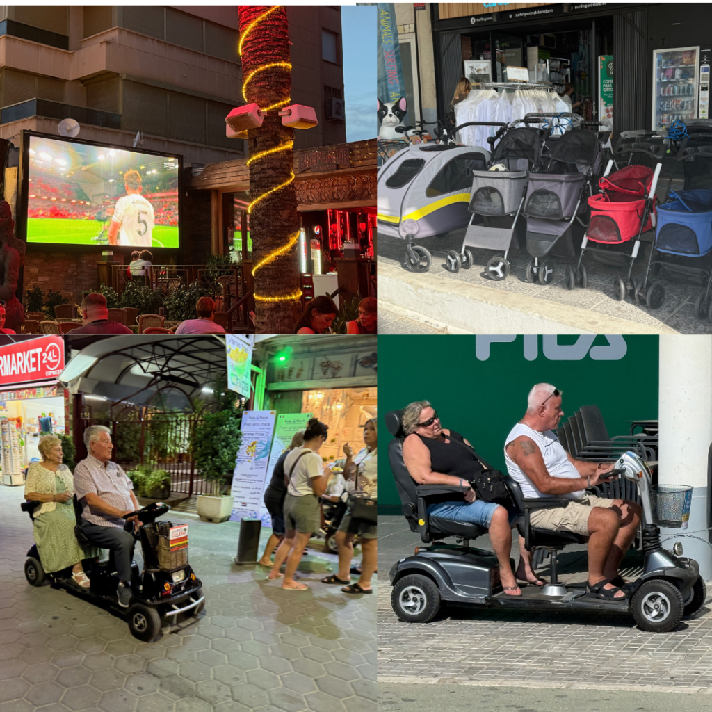 Mobility scooters – yep! single ones like you get at home and new to us, double ones, are everywhere. To be honest the most surprising thing about Benidorm is the demographic. During the day the majority of people you see are older, there are lots of multi-generational groups here with young children, but the majority out and about are older than us! and hundreds if not thousands of them are using mobility scooters. To be fair we’ve seen more wheelchairs this week than ever before too, the place is so well set up for them. The other interesting thing is the dog strollers – small and large dogs being pushed along in a stroller (pic below).