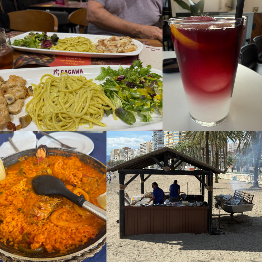 Food – being back beside the Med it is lovely to have seafood again. The food scene here is lively, there are loads of fab rooftop bars too. I haven’t had a paella since the Camino so we found a beachside restaurant that reviewed well and makes the paella from scratch. You order for 2 people here and it comes in a large pan, we ordered mixed so there was meat for Steve and lots of yummy seafood for me. This restaurant, like all of the others on the beachfront in Spain has a wee BBQ shack outside where they cook the fish, primarily sardines. Cool to watch and keeps the smells outside. Not a cheap meal but yum. Steve decided to try a local drink at one of the rooftop bars – Tinto de Verano – which is essentially chilled red wine mixed with lemon soda and fruit with ice, his report, it tasted like red wine mixed with lemonade.