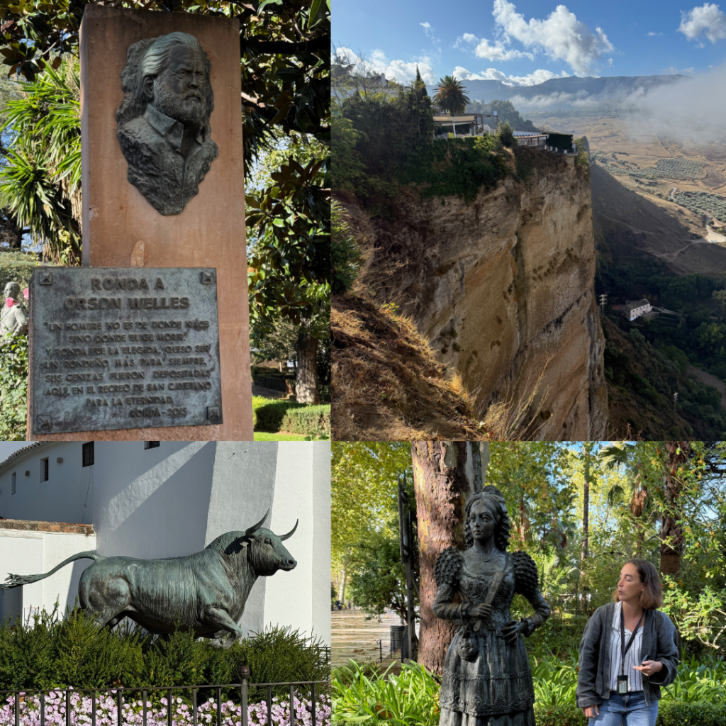 First stop was a park containing a few statues commemorating important people in Ronda’s history, Ernest Hemmingway, Orson Wells and other writers who based themselves there over the years, the architect who designed and built the bridge and the bullfighting ring, the person who invented modern bullfighting and a woman who represents the typical woman of a time in Ronda. Next we went to look at the view and could see just how high up the town is sitting on cliffs of stone. We were still in the new town (new being built in the 1700s), our last stop before crossing into the old town was the bullfighting arena – apparently the oldest in Spain and is still in use once a year. Our guide told us all about how her generation is anti-bullfighting and all boycotting it in the hope it will die out given it’s so cruel for the animals.