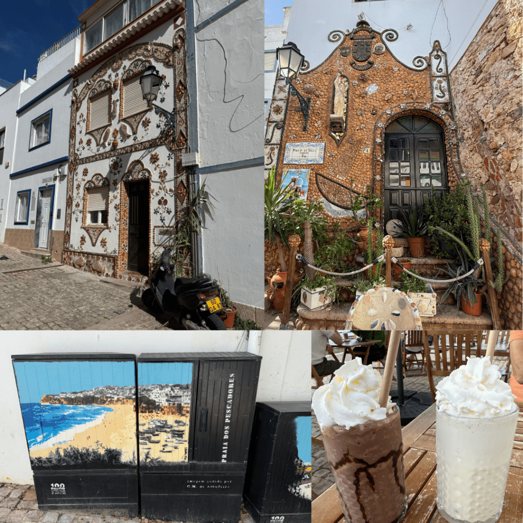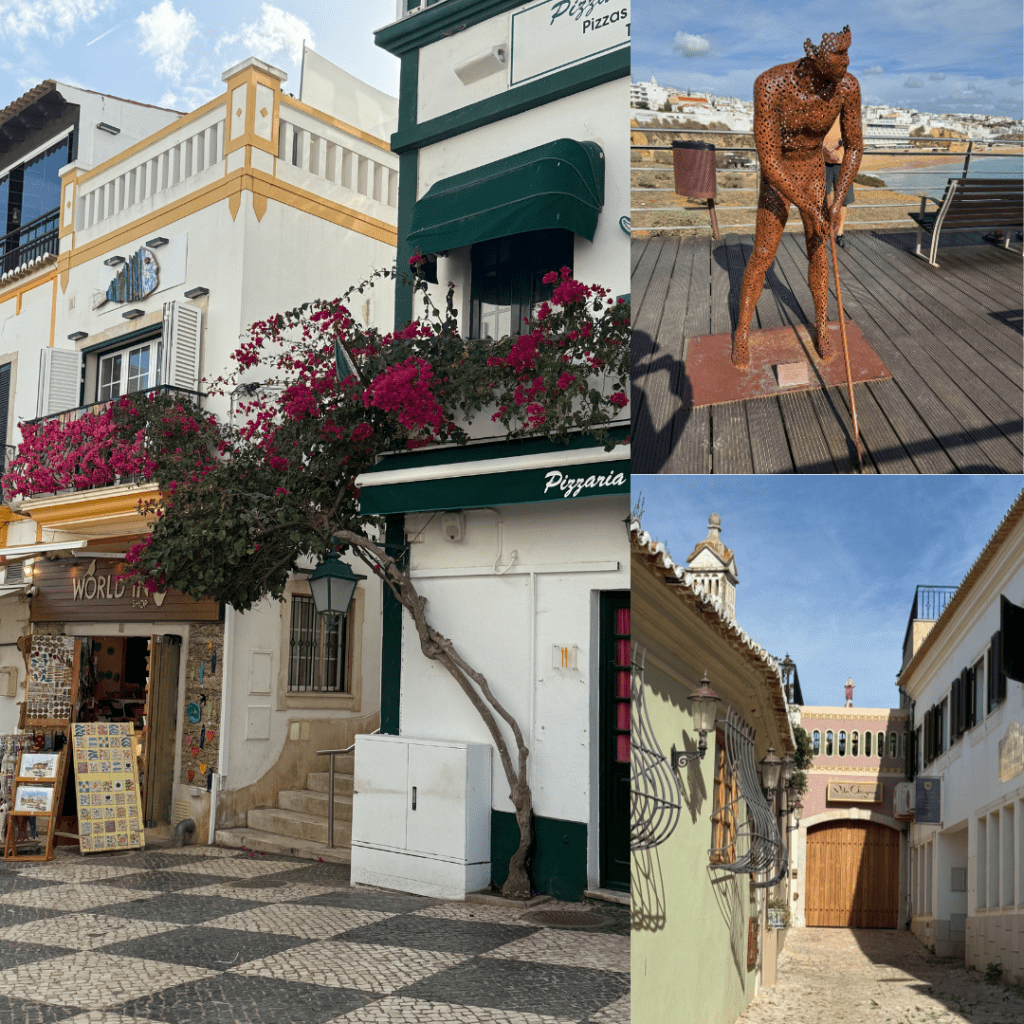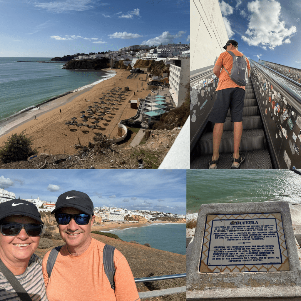 Albufeira – one of the first villages we wanted to visit was Albufeira, a resort town which is kinda a mixture of a Greek island and Benidorm somehow – white buildings with blue accents, narrow streets, but also a “strip” of bars and clubs which will be noisy at night. Topology wise there are two beautiful beaches with the town perched on the cliffs above. There are stairs and escalators to help get you from the beach below.