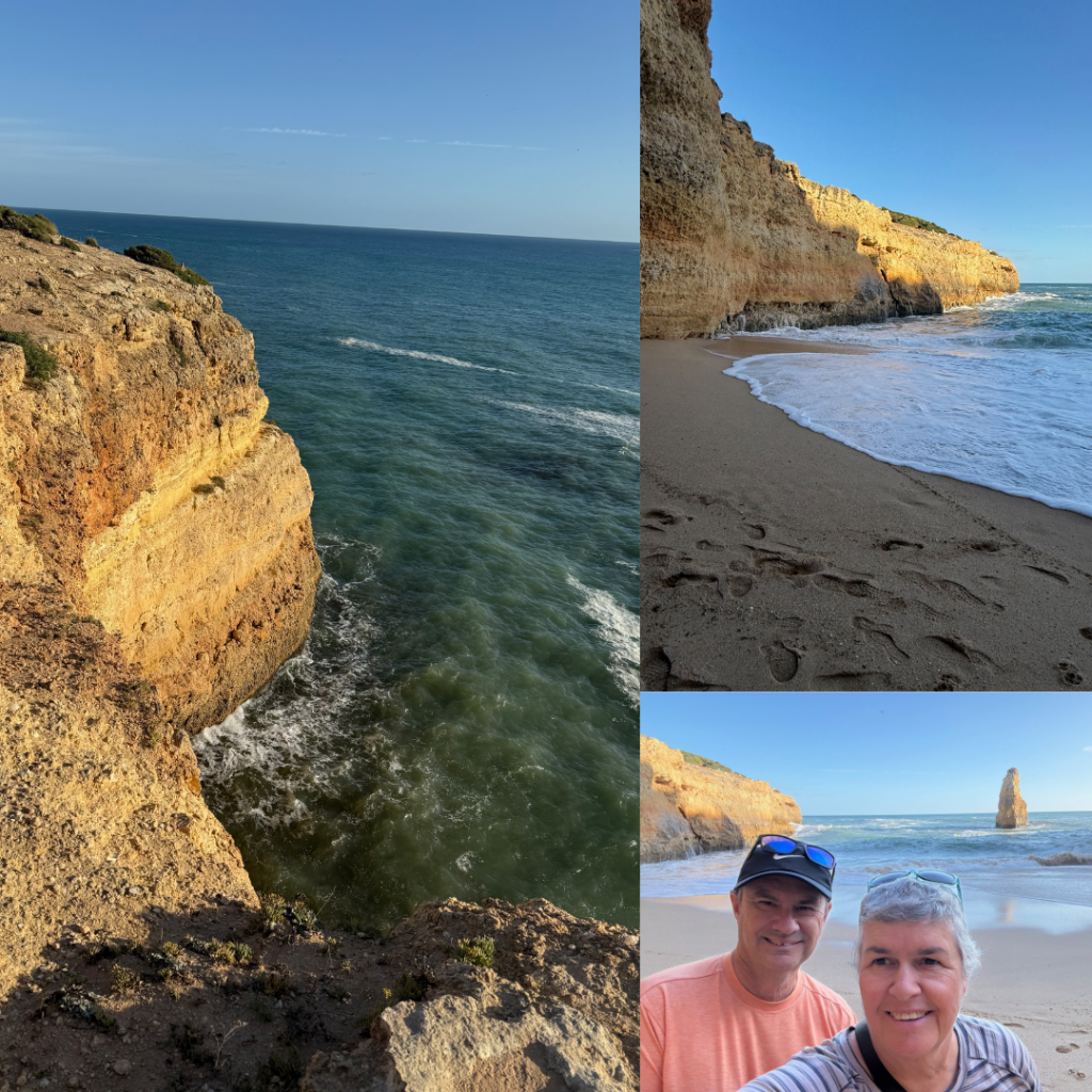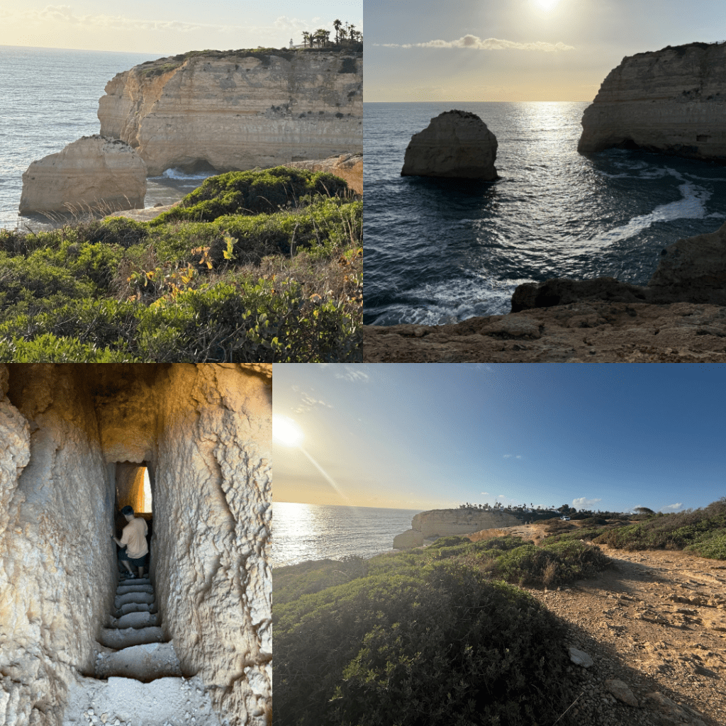 Praia do Carvoeiro – on our way home from Albufeira we stopped at this wee beach, well we parked high above the beach and walked down the stairs to the clifftop then down through a tunnel onto the beach itself. It’s so spectacular with the cliffs 40m above you, the sound of the waves which are powerful and the wee caves the waves have created in the cliff face too. From here we went back up and ventured up onto the cliff walk in an area where there is no boardwalk just picking your way carefully over the rocks and not going too close to the edge!