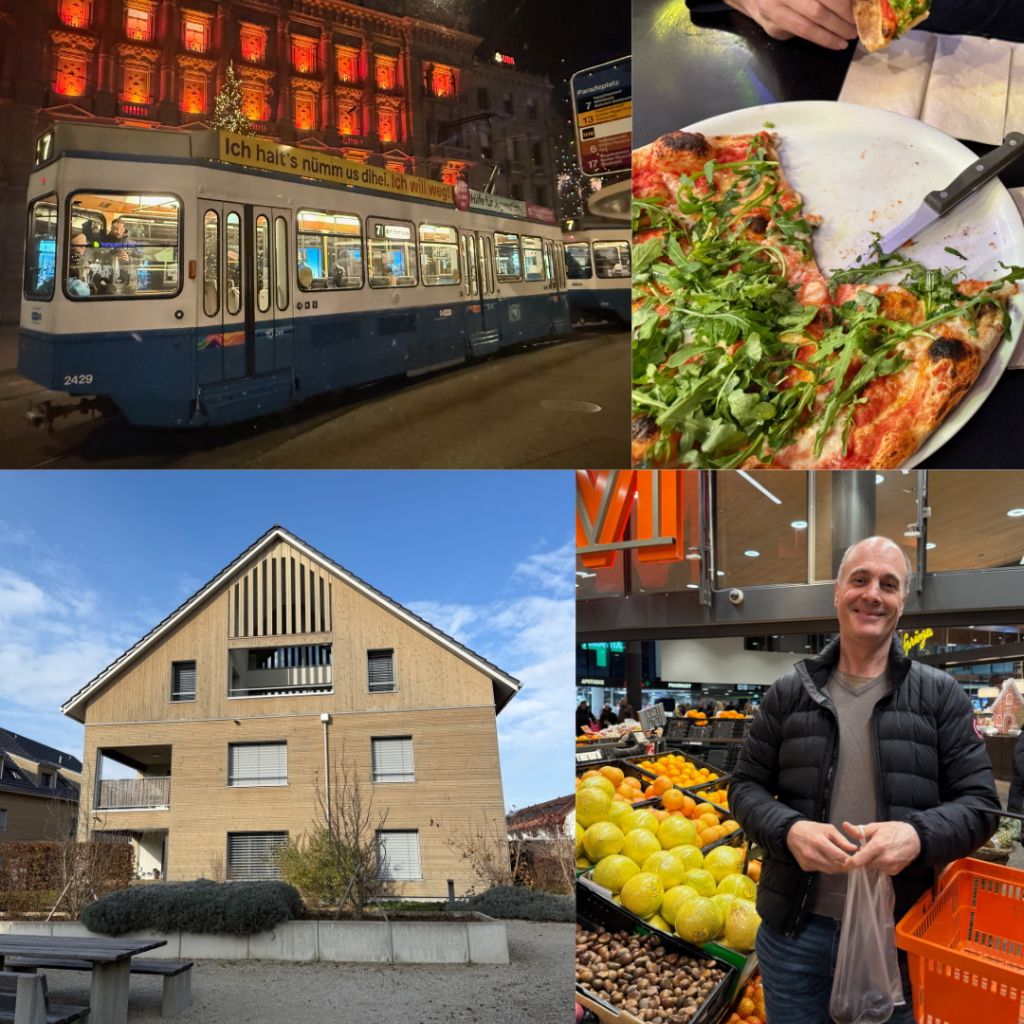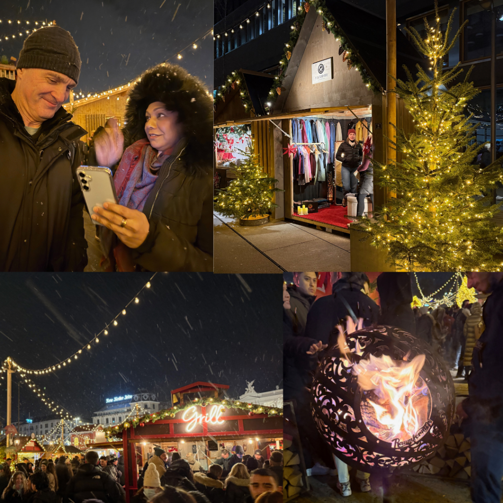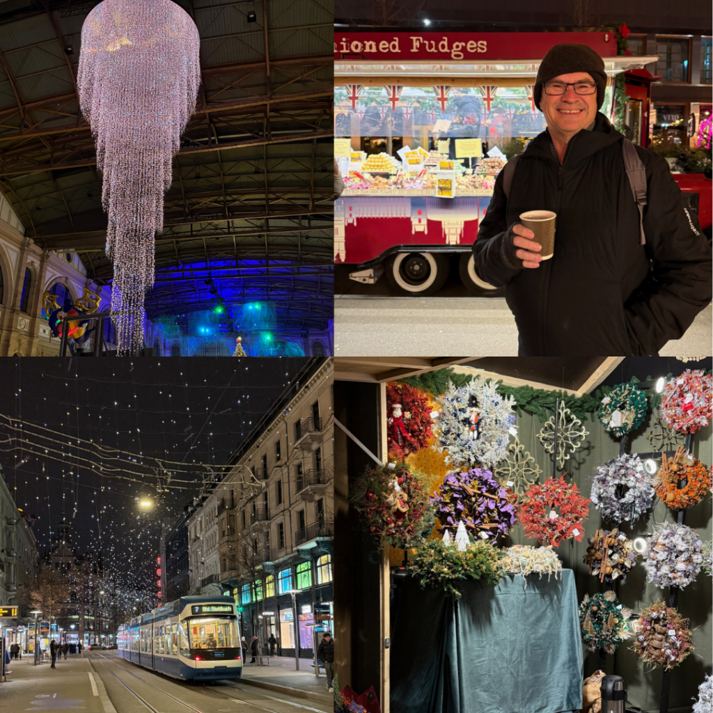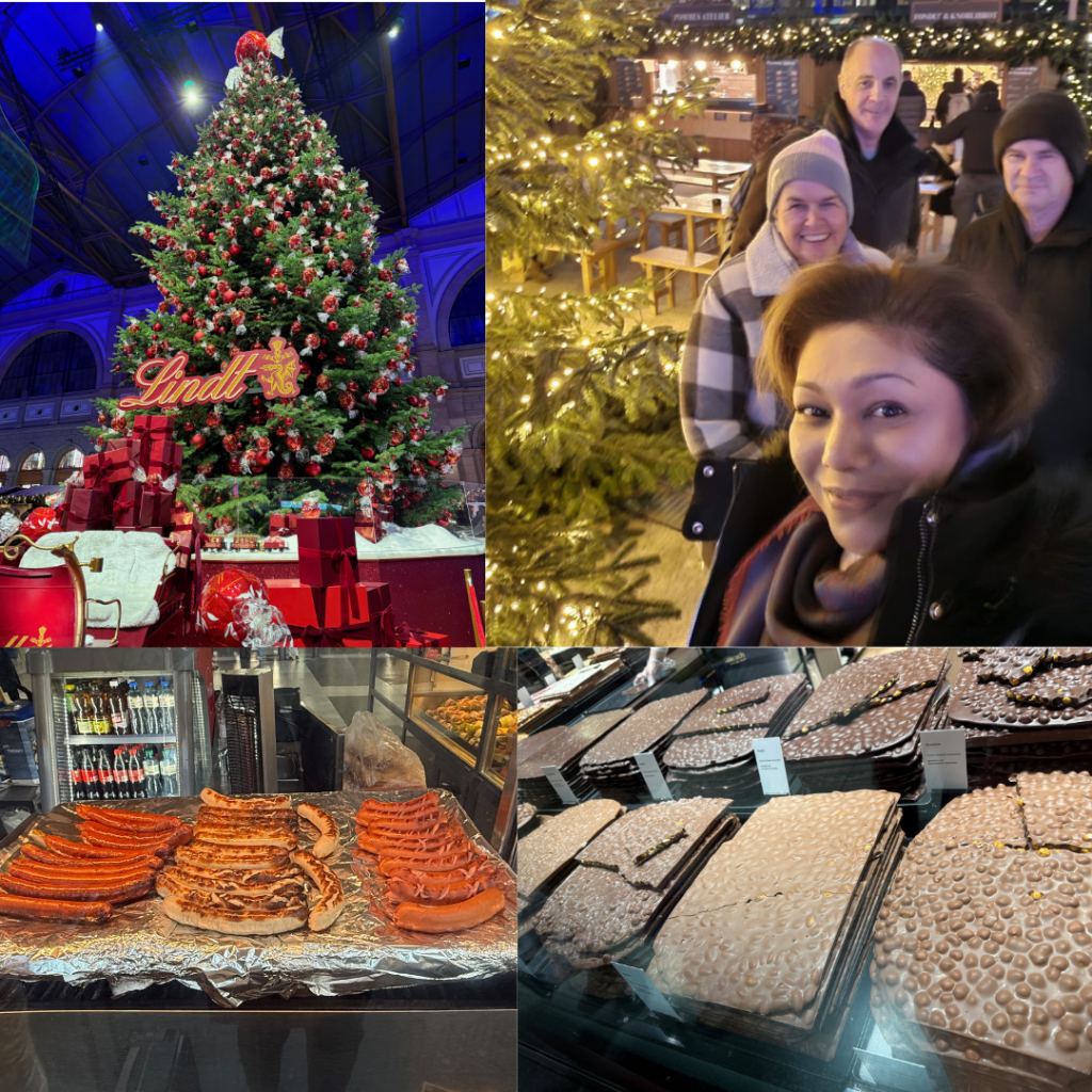 Geoff is off to NZ on the 5th of December and Zarina back to Malaysia, so we could only fit in a quick visit before his big trip. We have been to Zürich before and knew how expensive it was but being here again right after Spain and Portugal just reinforced it. We were only there 4 days (you can read about our alpine adventures here) but managed to fit in another completely different Christmas market on the Saturday night by ourselves, plus found a really great food market where we shared a pizza for dinner, enjoyed the vibe and people watched – it’s like a Time out market with up market vendors and great seating options.