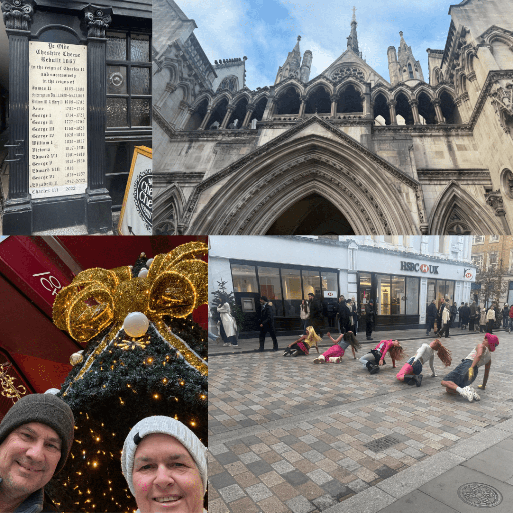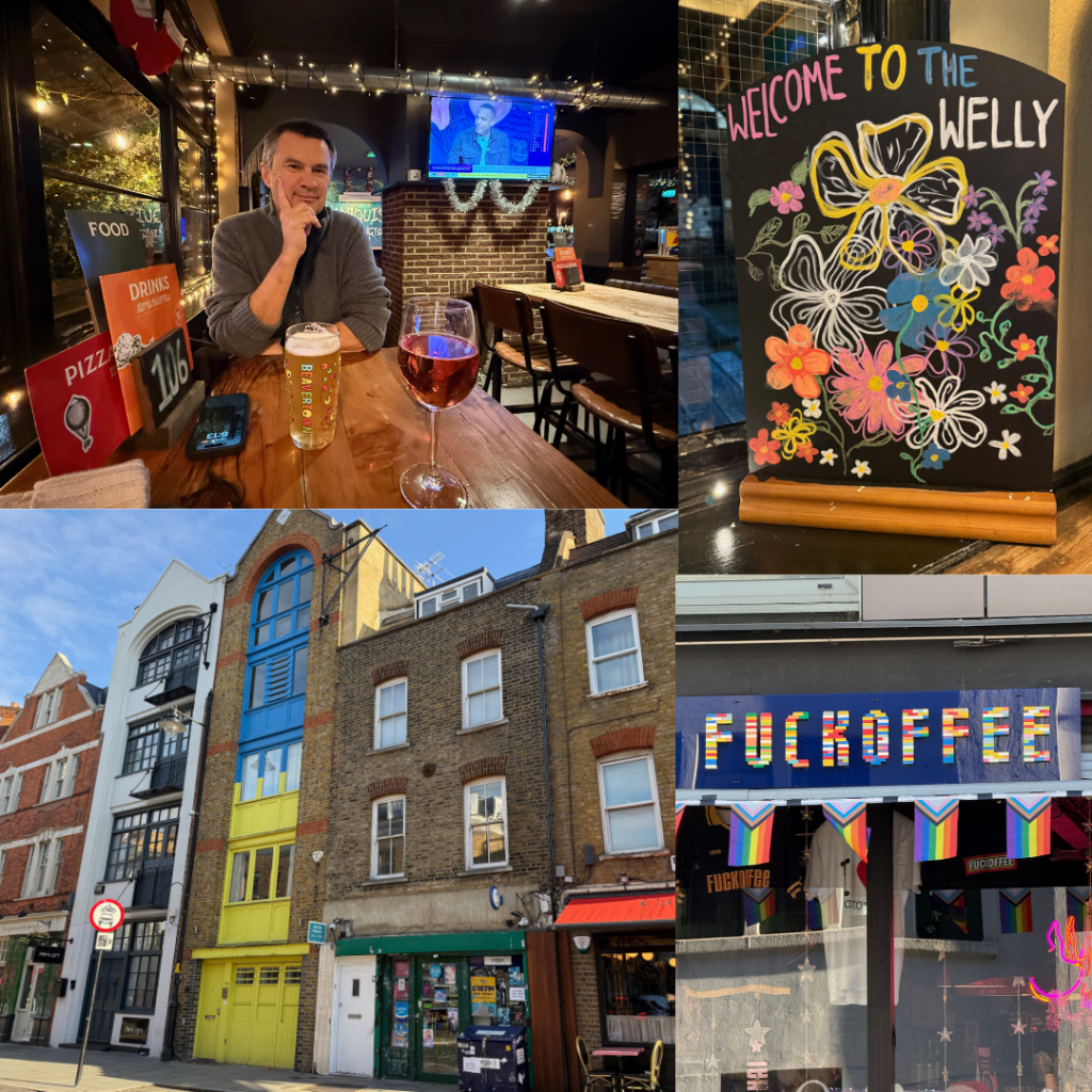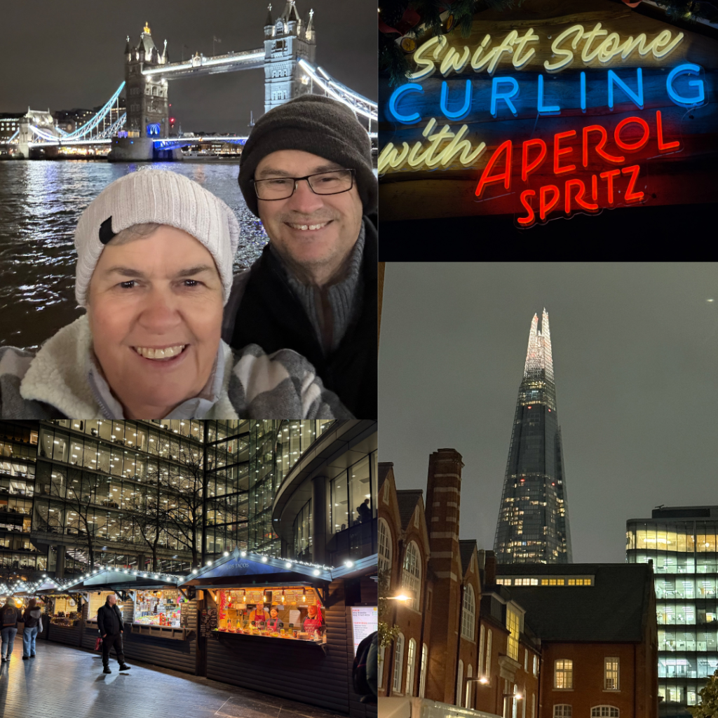That evening we headed to Tower Bridge which was about 15 minute walk to see the Christmas markets and lights along the side of the Thames. It was nothing like as decorated here as in Switzerland but still lots to see and lots of people to navigate. After a good walk we started to head home finding another local with a great name – the Welly. This one was totally different, busy, upmarket, great vibe and wine list. We would have settled in but loads of people arrived to watch the football so it got very loud all of a sudden. Great find.
