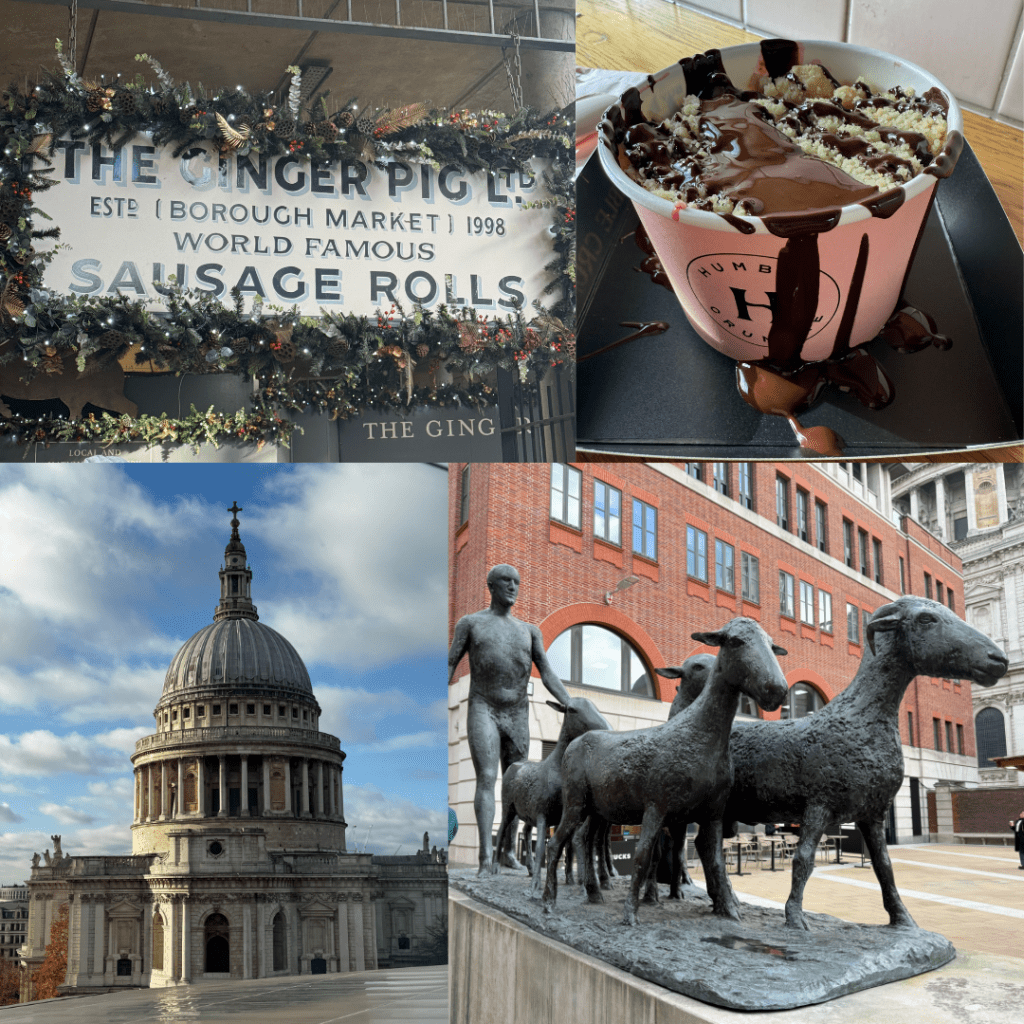 Next day we headed to Borough Market for breakfast (at 10am when it opens) first. It was slammed! There are a few TikTok trends featuring food here at the moment and we decided to try two of them – Humble Crumble first, which had a relatively short queue, we couldn’t bring ourselves to get the marshmallow topping I’ve seen heaps of on the internet but did enjoy our berry with Chocolate drizzle offering. After wandering around looking at all the great food and queues we joined a queue for fancy sausage rolls. It’s worth noting while there we saw loads of signs, bobbies (including two queueing in front of us) and there were announcements about cellphone thefts which are a big thing in London now.