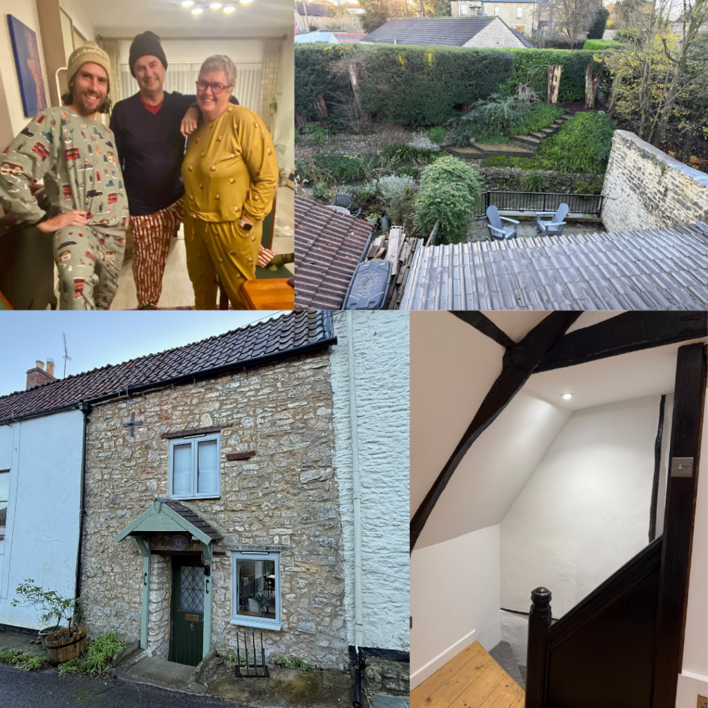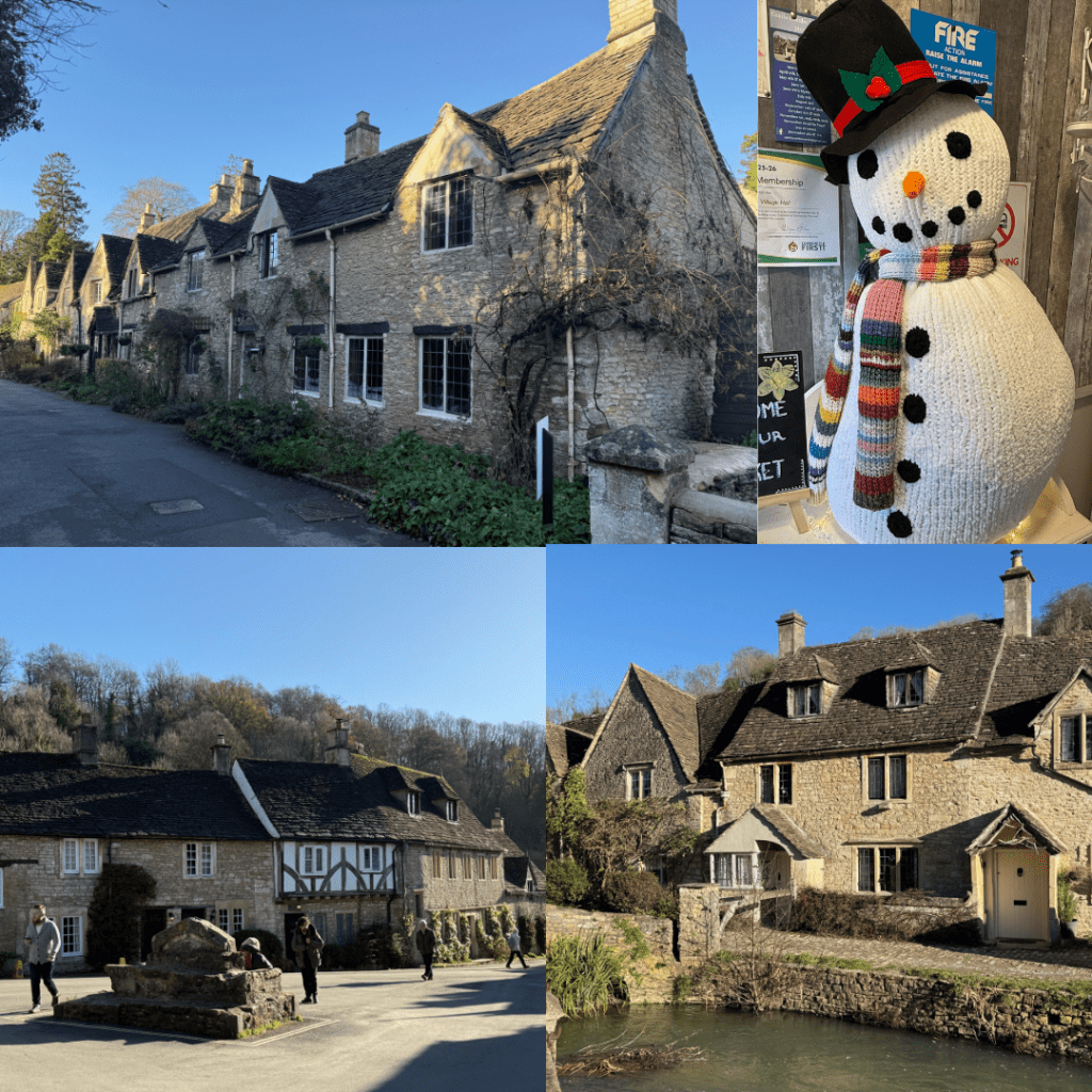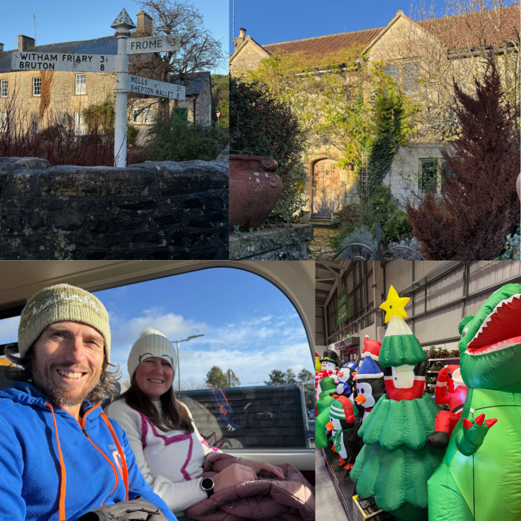 On the first morning Steve and I took a quick village wander to see the sites and buy eggs and bacon for breakfast to go with the yummy sourdough Karen had bought. The village is small but oh so cute. The castle has been long abandoned and the moat bridge closed off to the public with a deep moat inhabited by ducks and geese. One of the churches is still in use but the other one has no roof on the back part and the front is now used as a hall. Our plan was to spend the Friday at the Christmas markets but it was raining and Karen’s birthday, so we went shopping in Frome (the next town), played games, ate far too many yummy Christmas treats and watched Christmas movies, all while I taught Paul to knit and started my own crochet project. A lazy but fun birthday day.