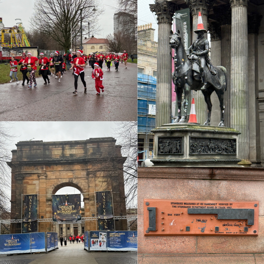 Glasgow – Next morning after our early breakfast we hopped on the train into Glasgow which is a spread out city so a great train ride in. It was due to rain so we made a beeline to the McLennan Arch – Glasgow’s own Arc de Triomphe – which has had a fascinating life, has been moved 3 times before settling in it’s permanent home at the entrance to the city gardens. As we walked towards the gardens we started to notice Santa’s, more and more the closer we got. It was of course a fundraising Santa run! The gardens were set up for the run and seemed to also have one of the cities Christmas markets there too. So the arch was covered in signage with Santa’s all around. I took a few pics for a group of runners who had just finished under the arch before we headed off.