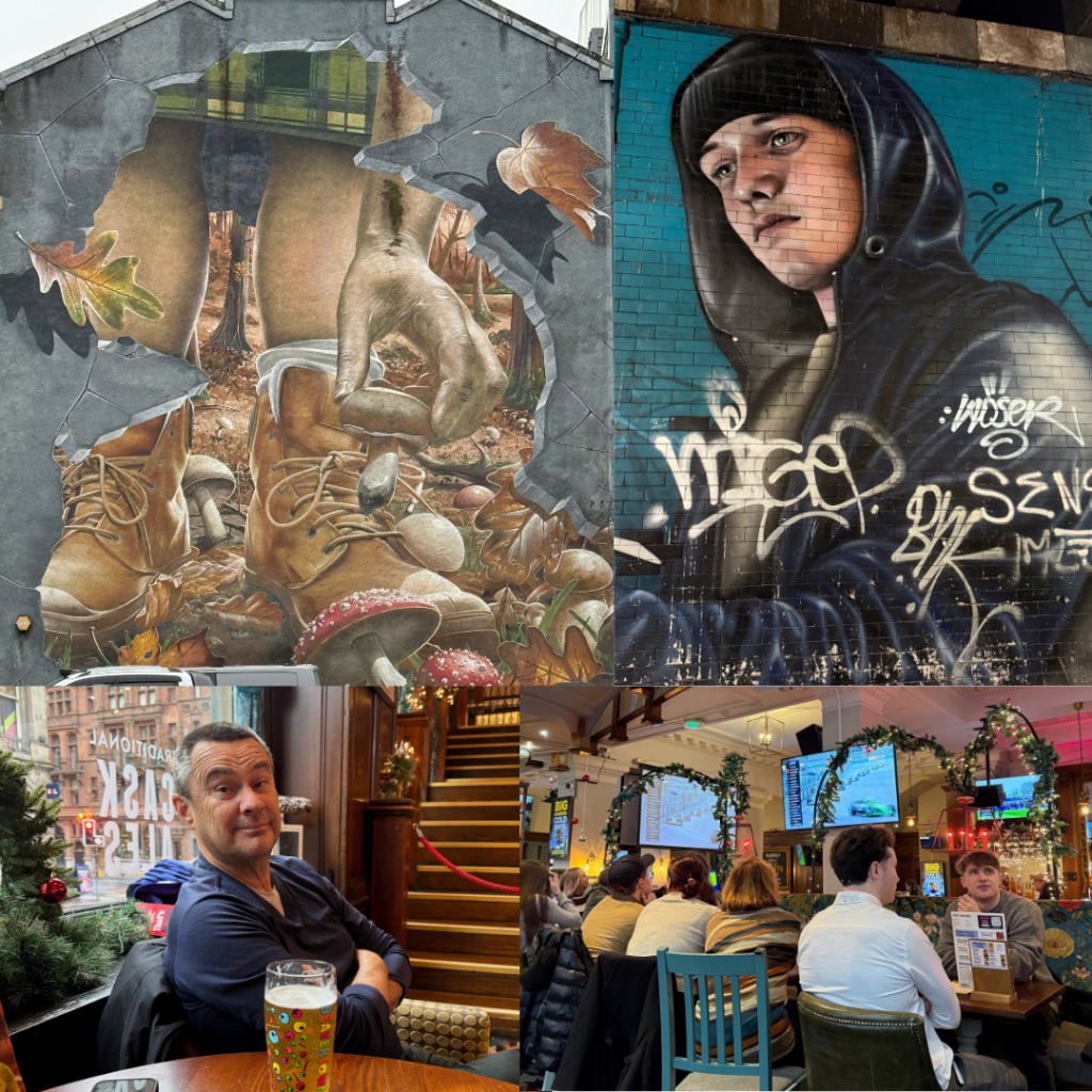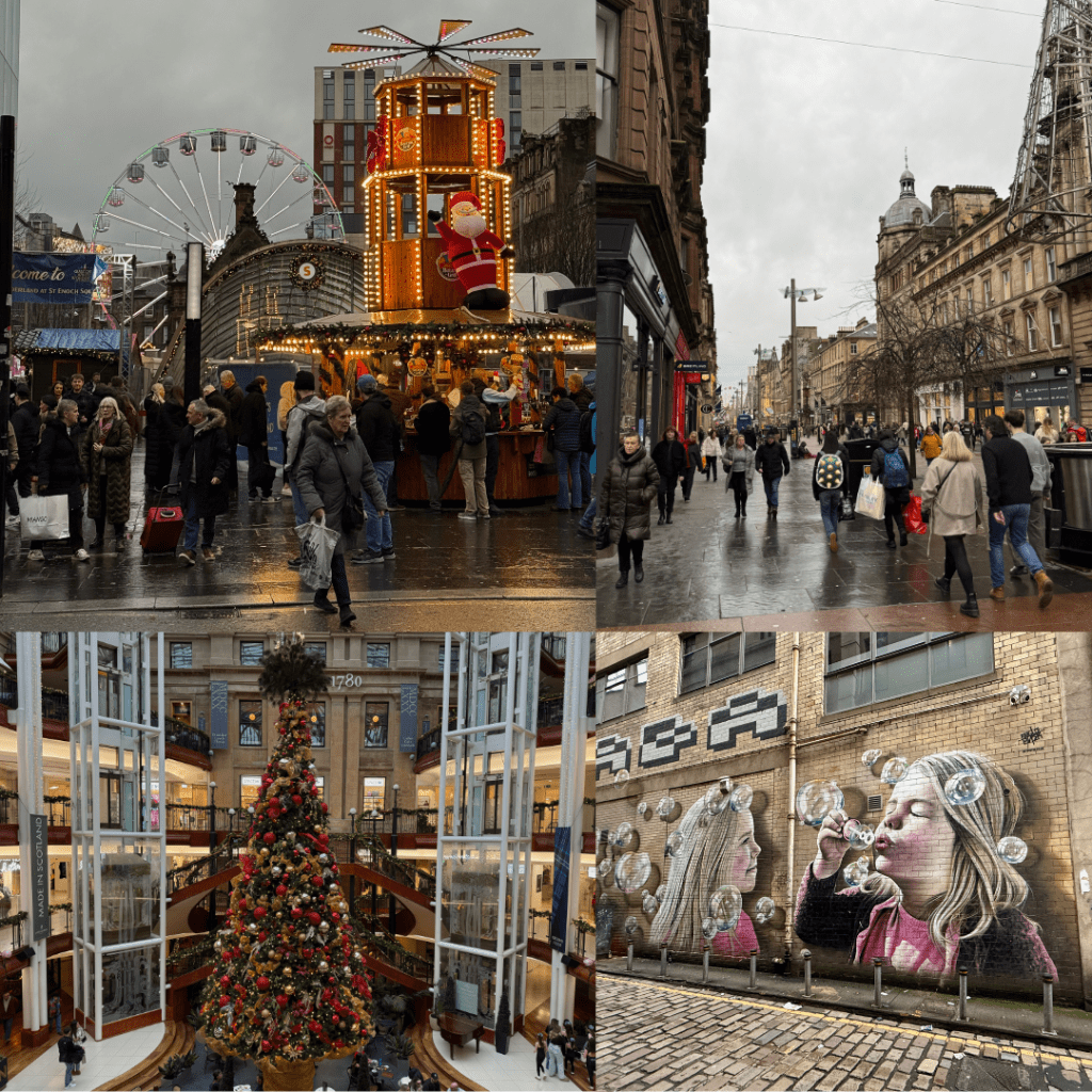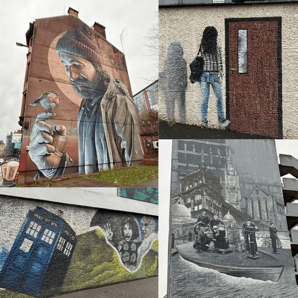 Glasgow also has an extensive network of murals / street art and again walking around these gave us a great perspective of the city itself. These UK cities don’t have verandahs or overhang where pedestrians can shelter so you need to be wearing rain protection when walking around here. Glasgow seemed nice, it has a lovely wide pedestrian only shopping street through the middle, no cars is great, and we went into a mall to see the fantastic decorations (a recommendation from our B&B host).