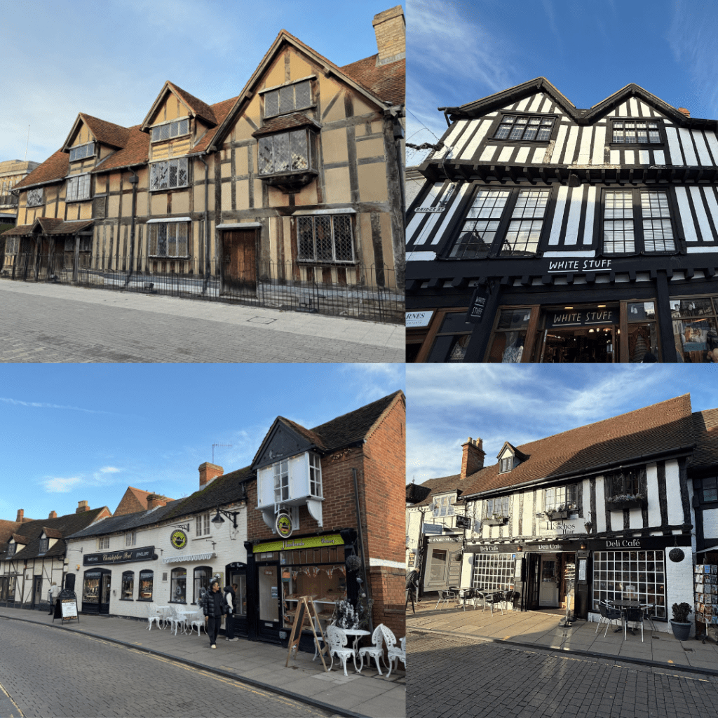 There were tour groups here at all the main sties, lots of Tudor looking buildings and a few monuments that were hard to get close to. We didn’t go inside anywhere just had lunch in a quirky old cafe. Shakespeares birthplace below top left.