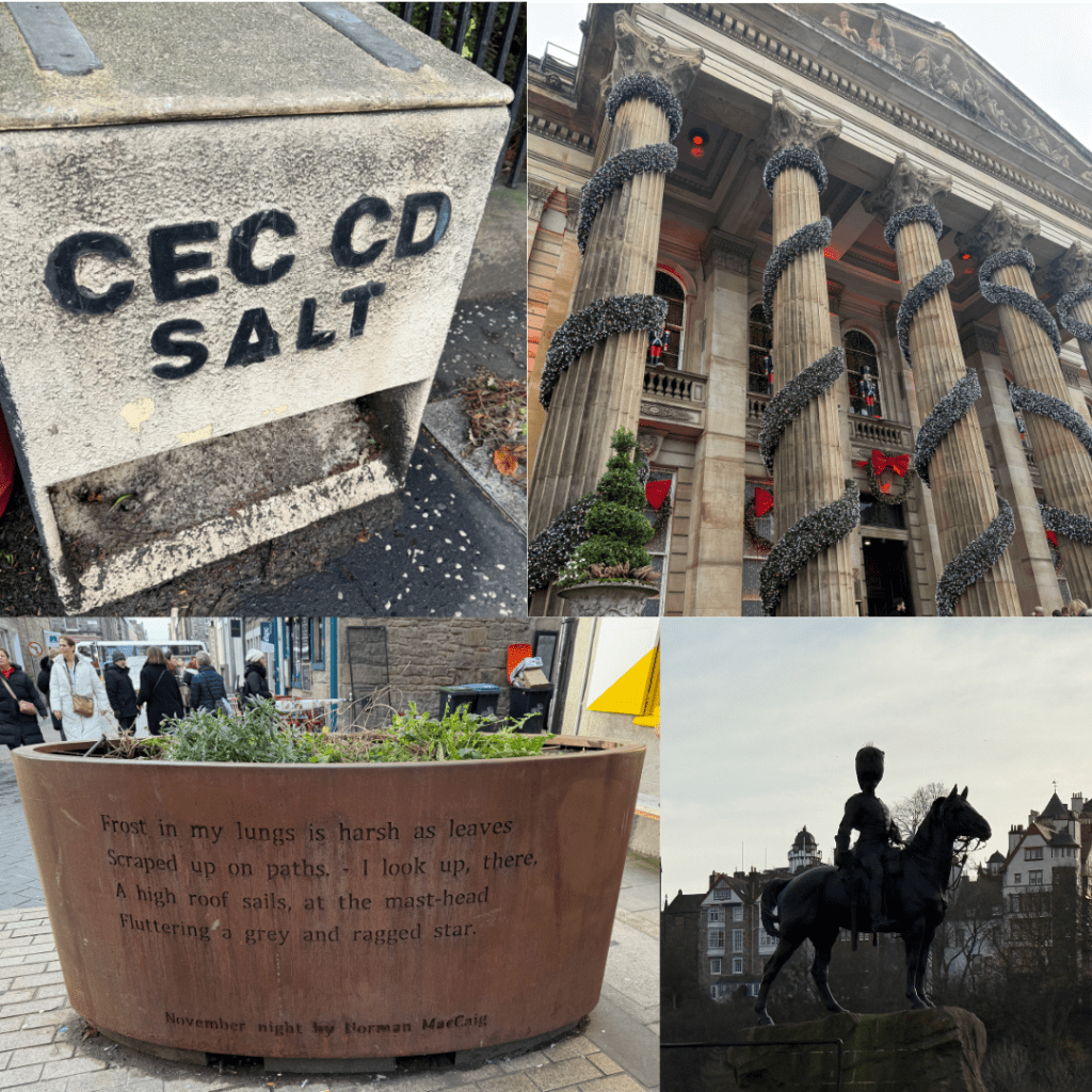 We then headed into the central city, following the river for a couple of km’s then up a steep street into town. I had forgotten about salt stations at intersections so enjoyed looking at the varying aged boxes in states of decay (the salt is to shovel on the road to melt ice for anyone wondering), plastic ones were faring the best it seems. Edinburgh is totally decked out for Christmas and its visually wonderful.