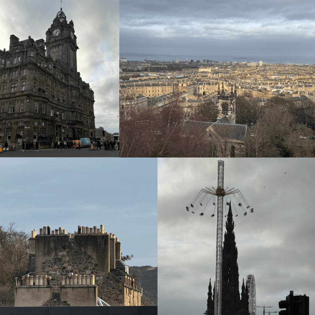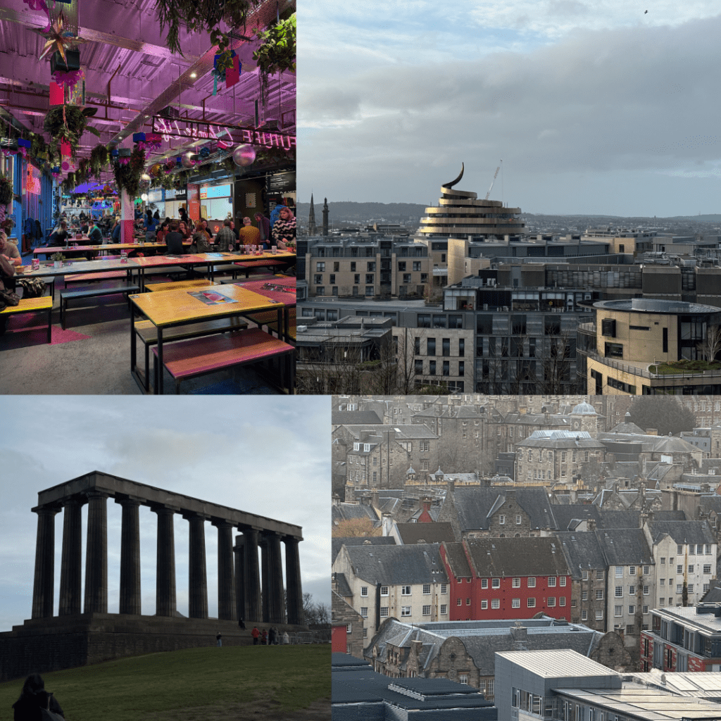 Our plan was to go up Carlton Hill next to get the lay of the land but took our time walking there via St Andrews Square to visit with Paddington, then towards the poo emoji shaped building in the new billion pound St James Quarter – which includes a fantastic multi-story open sided mall building which runs on a curve around the turd building. The view from the top of the mall was well worth checking out especially the vista up to Carlton Hill. We contemplated lunch in one of the two food halls inside the St James Quarter but decided they were too busy or expensive, so it was awesome to come across the Edinburgh Street Food indoor / outdoor complex really nearby. The deal there is you find a table and order by QR code with all of the 15 or so food stalls via the one portal – so we of course ordered far too much but omg it was all yummy.