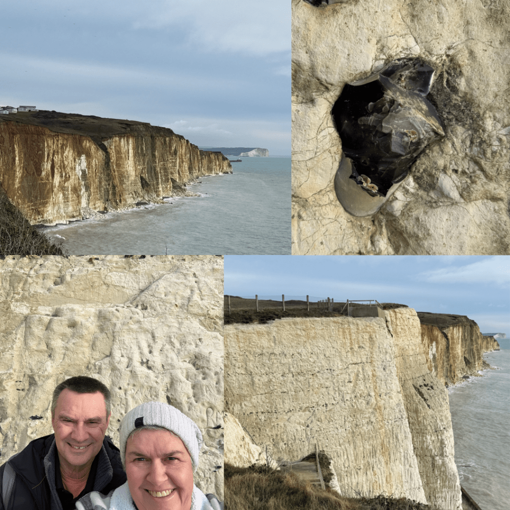 The Cliffs – We got off the bus and headed to the Friars Bay steps. The cliffs are fascinating, clay and chalk with something that looks like flint in layers throughout, they have a glass like texture and we also saw the flint used in both buildings and garden walls. The chalk gives the sea a white hue and makes it look murky. The view from the top of the cliffs is awesome and goes for kms in both directions, they are about 24m high here but get much higher at Beachy Head where they are 162m high!