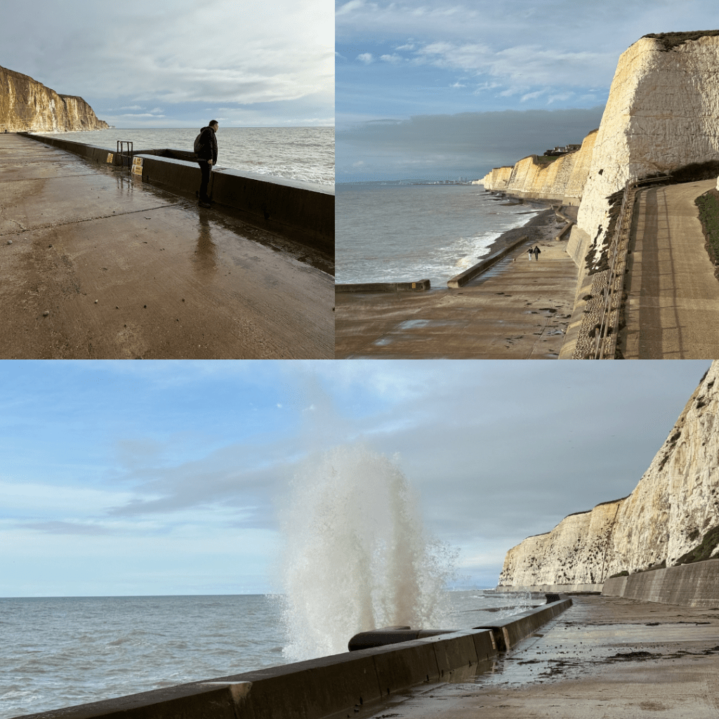 We walked down the steps to the sea wall path, it’s really wide and part of an erosion preservation system they have employed here. I read there is an undersea chalk bar not far out to sea and that the erosion along this coastline is accelerating and causing great concern.